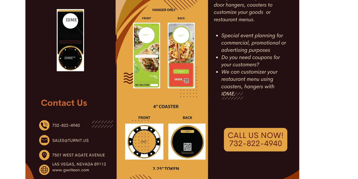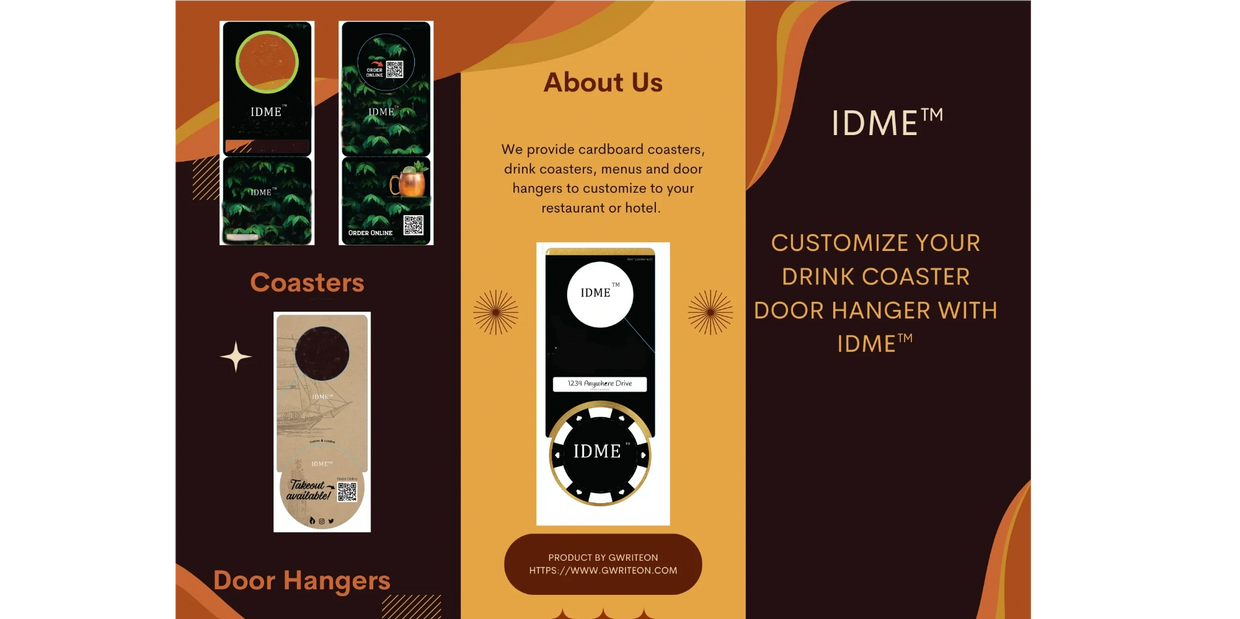 IDME™ Door Hangers and Coaster can be customize to your restaurant or hotel to provide personalization. It provide customers take home IDME™ Coasters easily scan for menu items. Promotional for Restaurant and Hotel at your door!